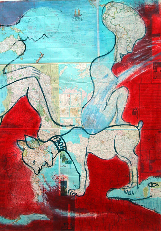 "who is afraid of red and blue? " acrylic on maps, 58 3/8 x 81 inches 148,3 x 205,5 cm © by J. Trautwein 2003